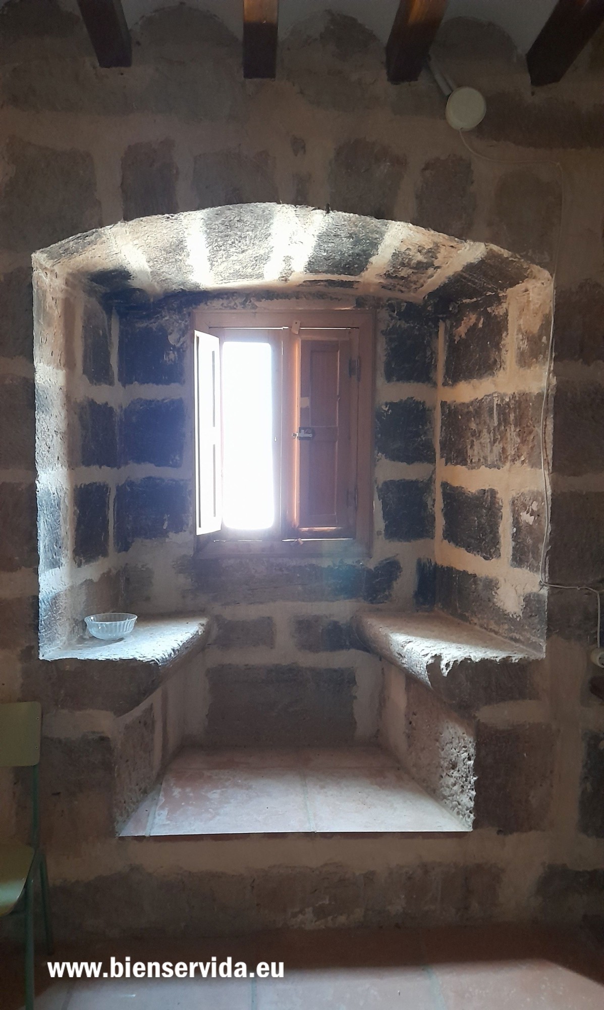En el caso de la sacristía de la iglesia de Bienservida, al tratarse de muros con mucho espesor, para aumentar la luz que entra desde el exterior y más en este caso en que las ventanas tienen orientación al mediodía, tanto las jambas (laterales del hueco) como el dintel capialzado (que convierte el dintel recto de la ventana en un arco en la parte superior) se construyen aumentando el hueco hacia el interior (abocinamiento). Con esto se consigue aprovechar al máximo la luz natural para iluminar este espacio.