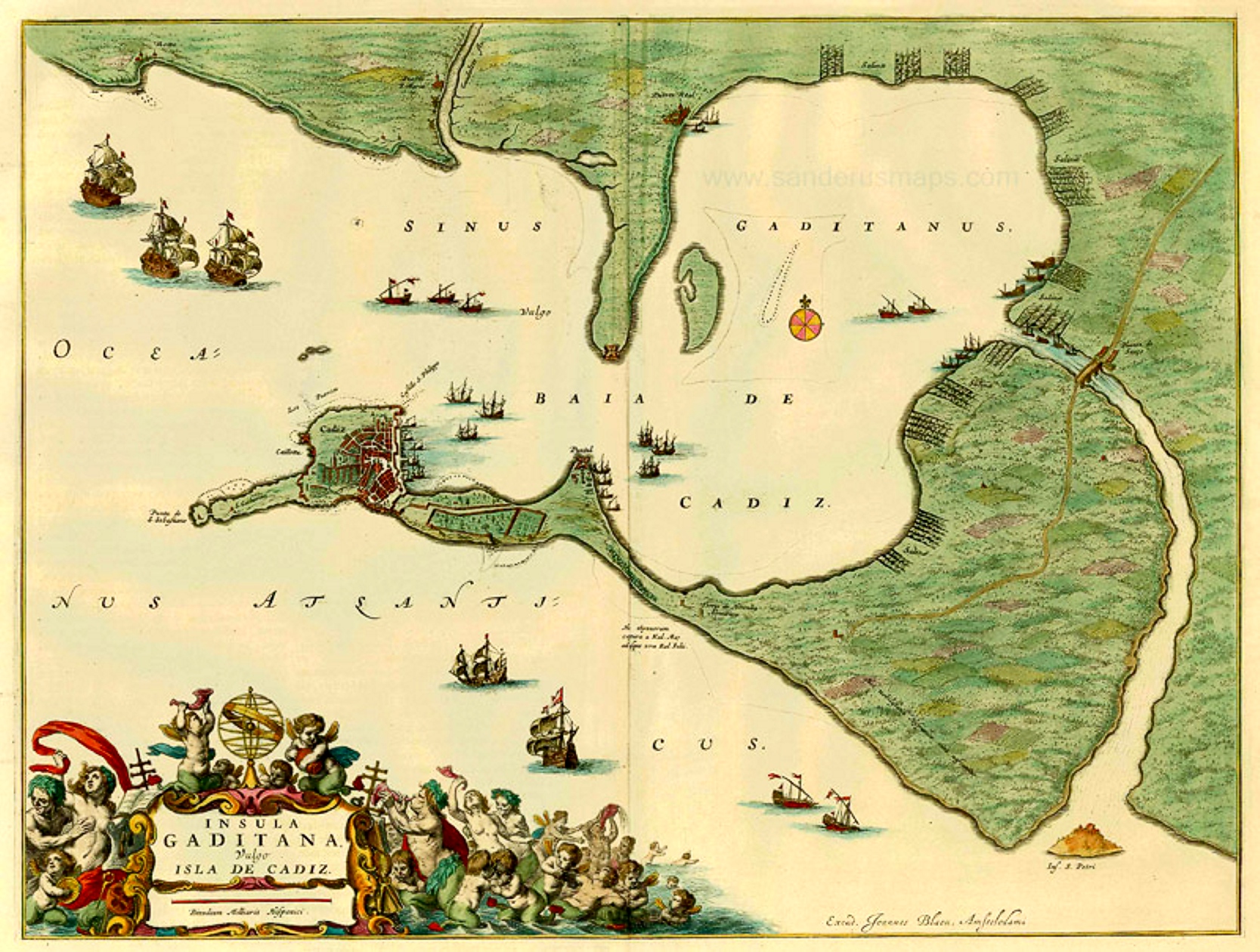 Mapa de la bahía de Cádiz, perteneciente al "Blaeus Grooten Atlas" de 1664.
