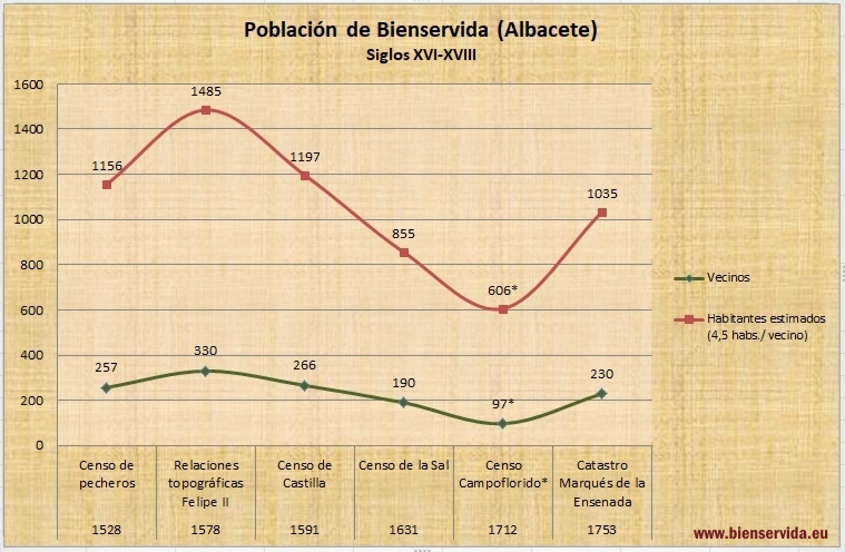 * Bienservida según el Censo de Campoflorido tenía 97 “vecinos útiles” en 1712. Utilizando la corrección propuesta Por J. Uztariz, por la que aplica primero un factor corrector de 1,25 para compensar las ocultaciones en el censo y uno de 5 para convertir el número de vecinos en habitantes, teniendo en cuenta que en los vecinos útiles desde el punto de vista fiscal no se incluía el clero ni los mendigos y se calculaban dos viudas por vecino, obtenemos esa cifra de 606 habitantes (Ver Instituto De Estadística de la Comunidad de Madrid. Censo de Campoflorido 1712).
