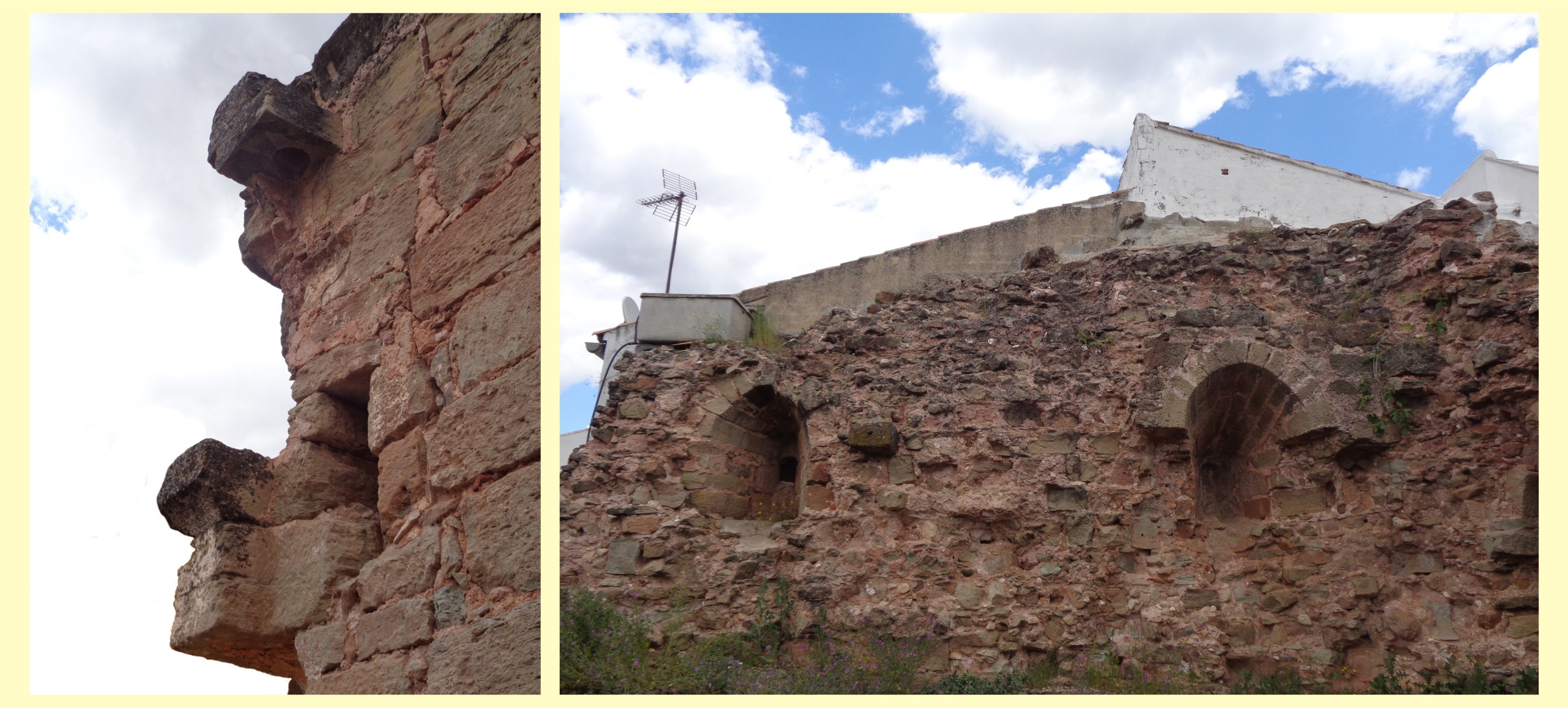 A la izquierda restos del dintel, del arranque de un arco y arriba una gorronera (hueco en el que entraría el eje superior de una puerta para permitir su giro). A la derecha dos ventanas abocinadas con cubierta de medio punto, tipo saeteras