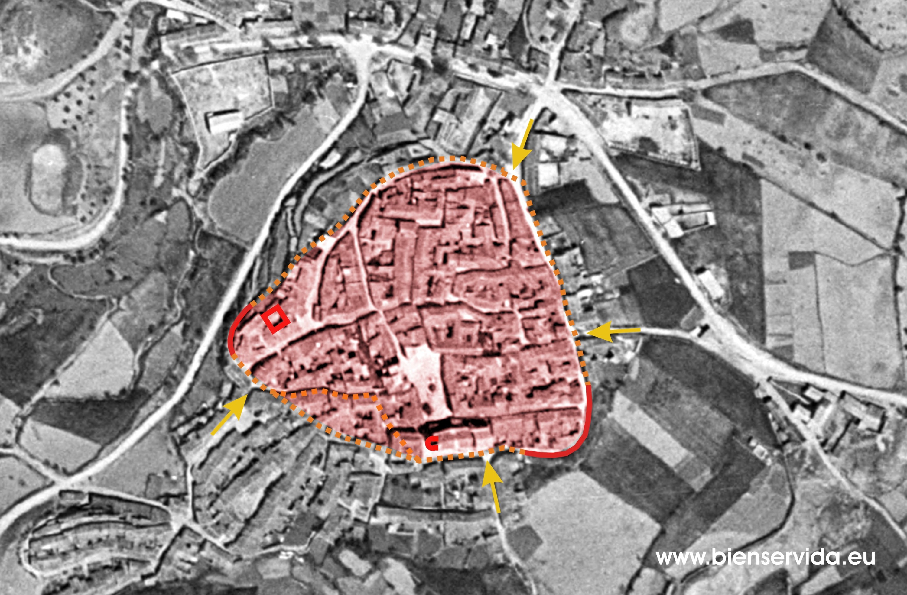 Perímetro de la primitiva villa de Bienservida sobre fotografía aérea de los años 50 perteneciente al llamado “vuelo americano” (IGN). En rojo los elementos que se conservan o de los que tenemos referencias directas por imágenes y en naranja el posible trazado de la cerca, con dos hipótesis en la parte sur. Las entradas a la villa serían cuatro, siendo la principal la del Norte (por la Calzada) y se señalan con flechas amarillas.