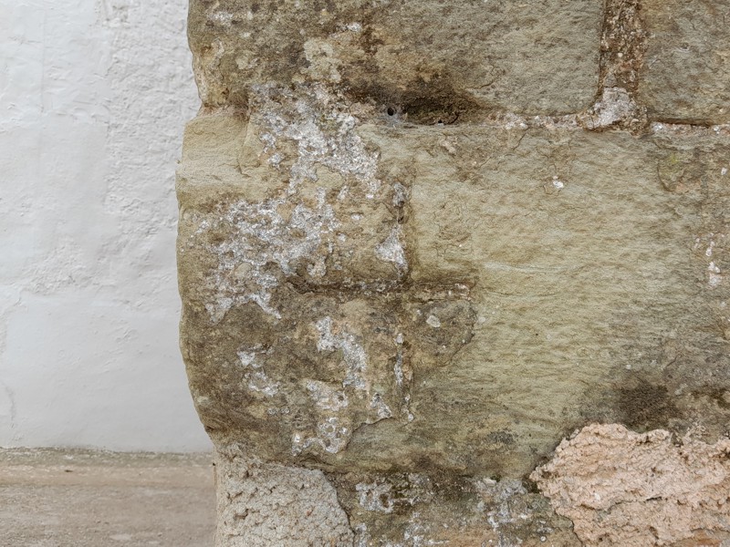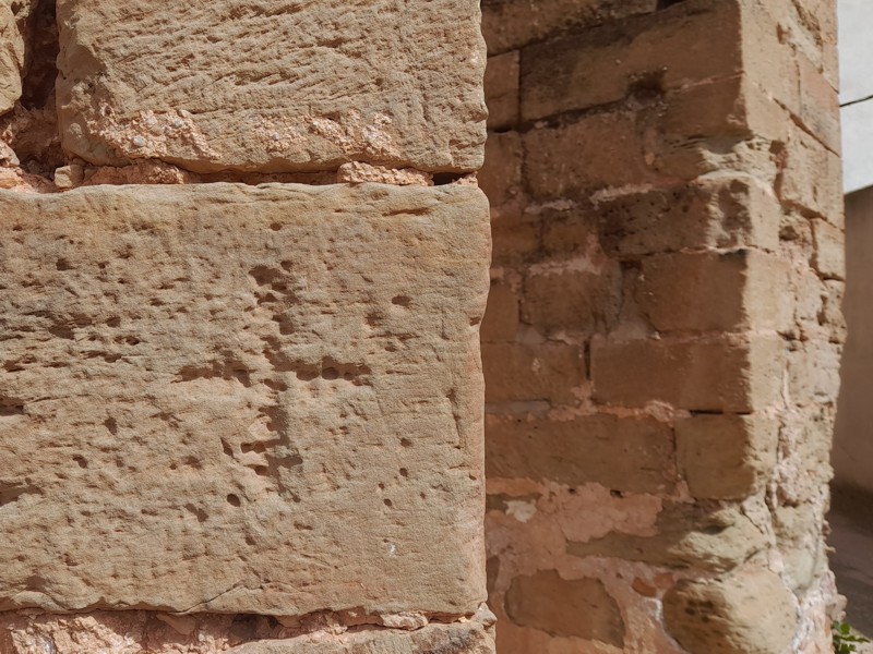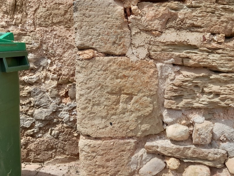Cruces griega y latina grabadas en los muros de la Iglesia de San Bartolomé