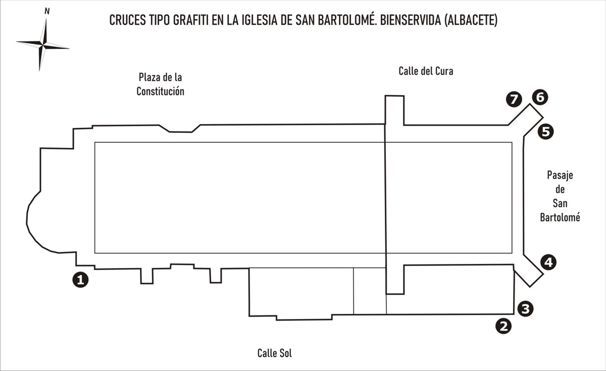 En este apunte analizamos siete cruces que hemos podido localizar, grabadas en los muros de la iglesia de San Bartolomé de Bienservida. Estas cruces incisas grabadas en el exterior de los muros de la iglesia, son manifestaciones populares de religiosidad, hechas para ser vistas en determinadas condiciones de luz, cuya datación es muy difícil, ya que no tienen asociadas fechas ni inscripciones que nos permitan situarlas en el tiempo. Por su simplicidad, tampoco es posible encasillarlas en un estilo artístico concreto. En este sentido, la bibliografía nos dice que, aunque su cronología es muy amplia, son más frecuentes hasta finales del siglo XVI, si bien existen grabados de este tipo desde la Edad Media hasta épocas relativamente recientes.