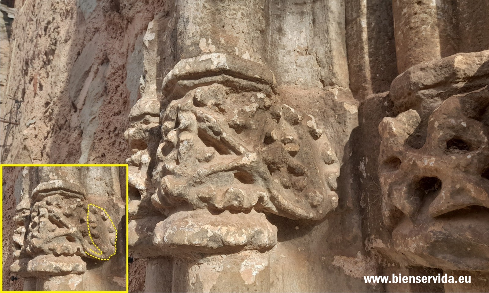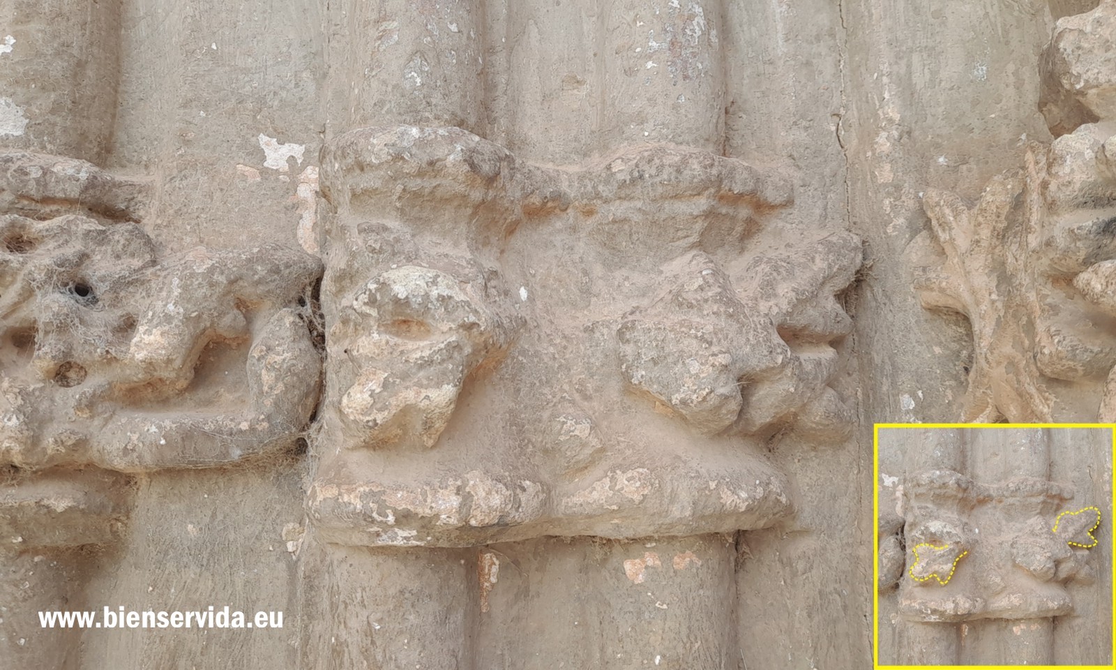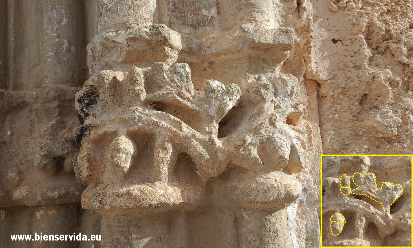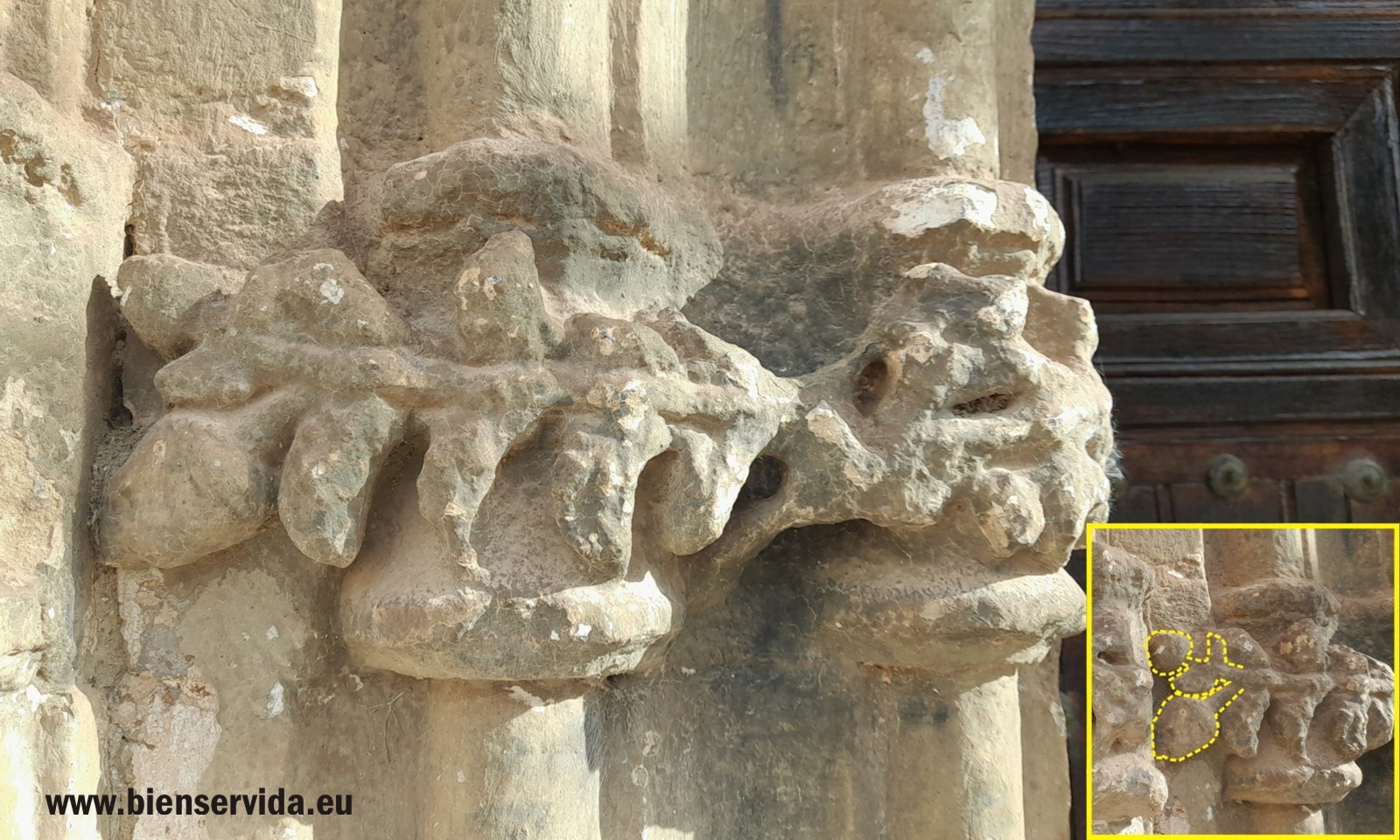 • 5 - Mixtura de elementos vegetales, seguramente roble por el rizado que se observa en la parte mejor conservada, y a la derecha, lagarto o salamandra y serpiente, que parecen luchar. Estos mismos dos reptiles (o reptil y anfibio en el caso de ser una salamadra) están esculpidos en uno de los capiteles góticos de la portada de la Iglesia de San Sebastián de Villapalacios.