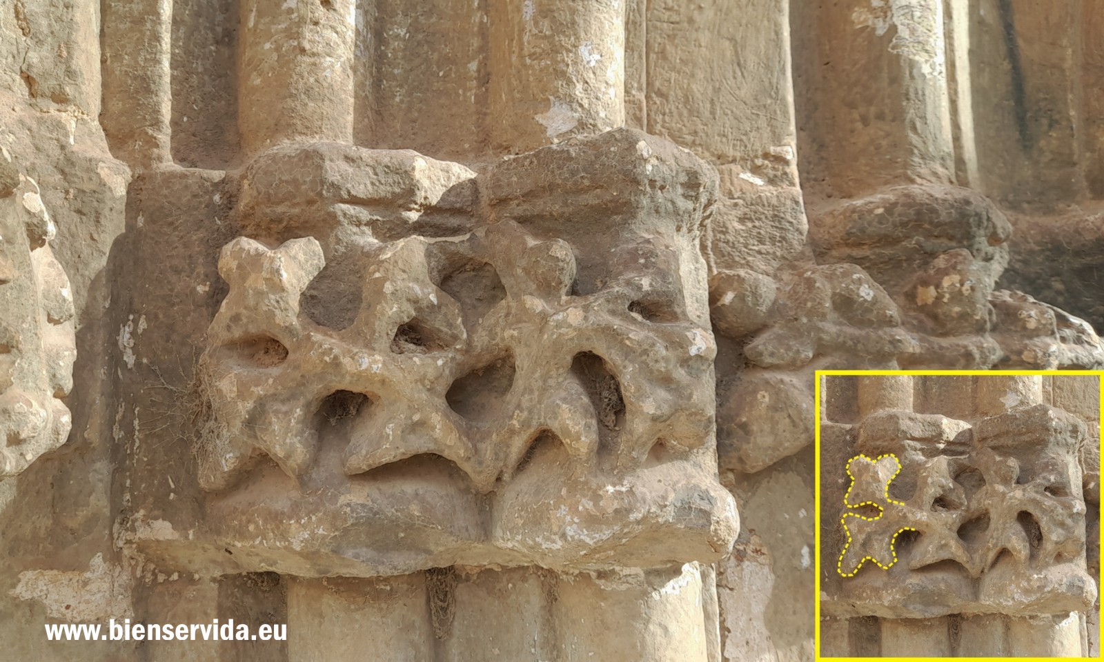 Pese a su deterioro por el paso del tiempo, ya más de cinco siglos desde su construcción, todavía es posible identificar, aunque a veces de forma dudosa, muchos de los elementos esculpidos en los capiteles, todos ellos muy característicos del arte gótico final.