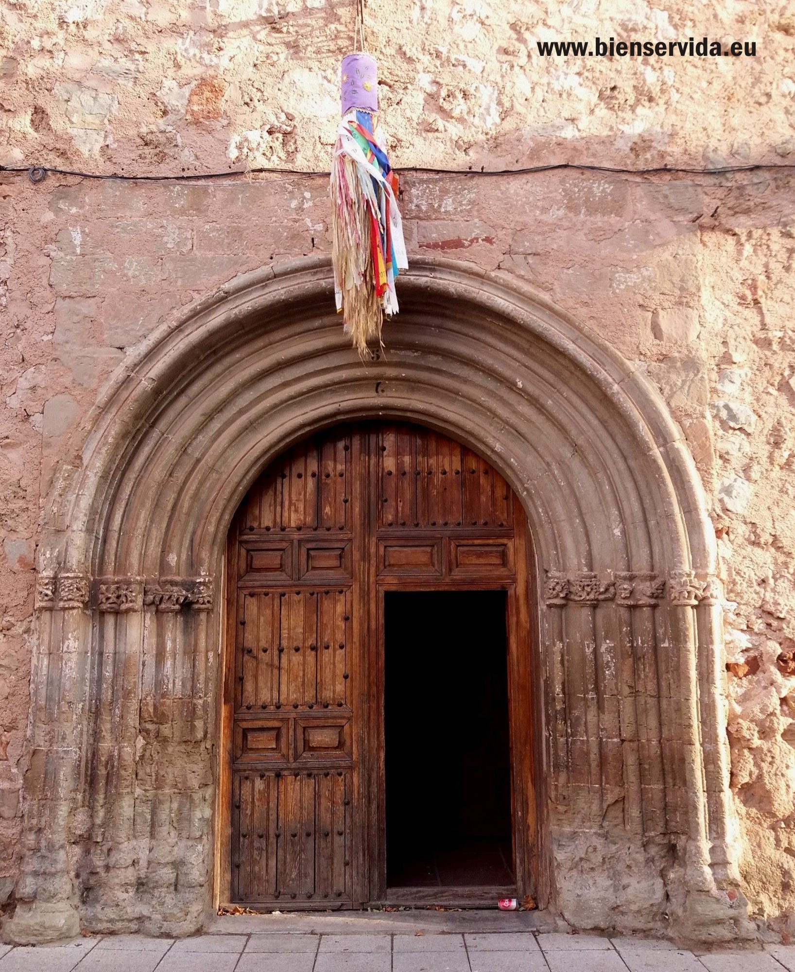 La portada tiene seis finas columnas a cada lado, con basas muy deterioradas por la exposición a los elementos y fustes lisos, adosadas a las jambas que son abocinadas. El arco de medio punto está formado por seis arquivoltas en gradación, que nacen de unos capiteles corridos decorados con motivos vegetales. Cada motivo vegetal corresponde al nacimiento de dos arquivoltas. Este tipo de capitel es típico del arte gótico.