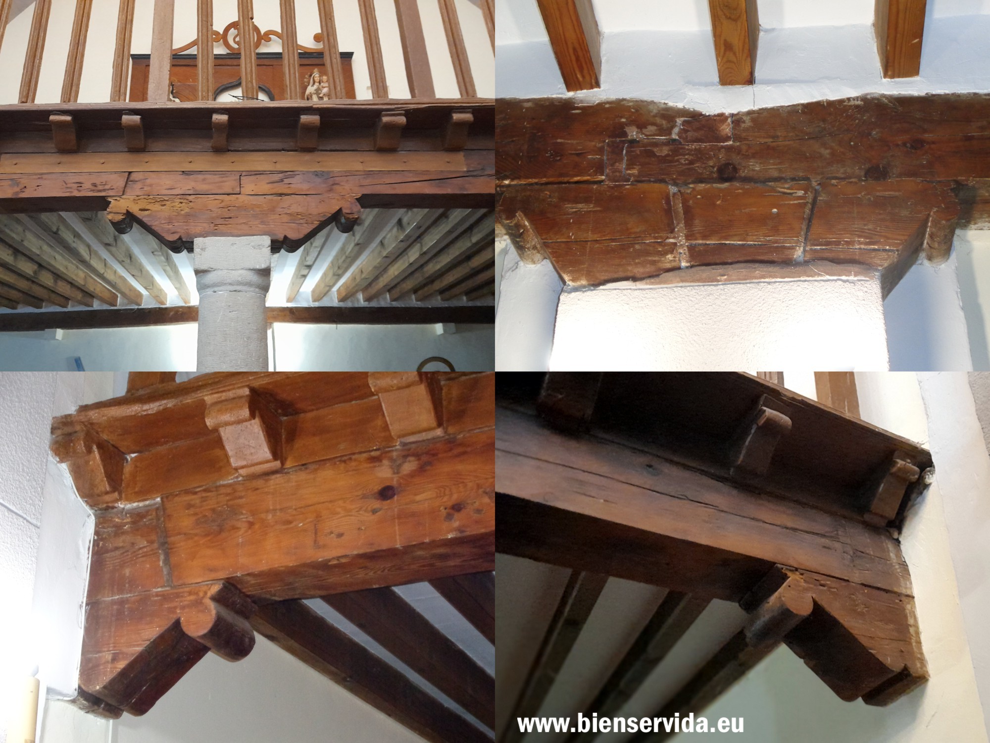 Sobre esas dos vigas maestras se apoyan un conjunto de vigas perpendiculares (jaldetas) que son la base de la plataforma que constituye el suelo del coro. Encima de la viga maestra, un canecillo central y doce más a cada lado (nuevamente encontramos el simbólico número 12 en un elemento de la iglesia) sustentan una balaustrada de madera, que delimita el espacio del coro.