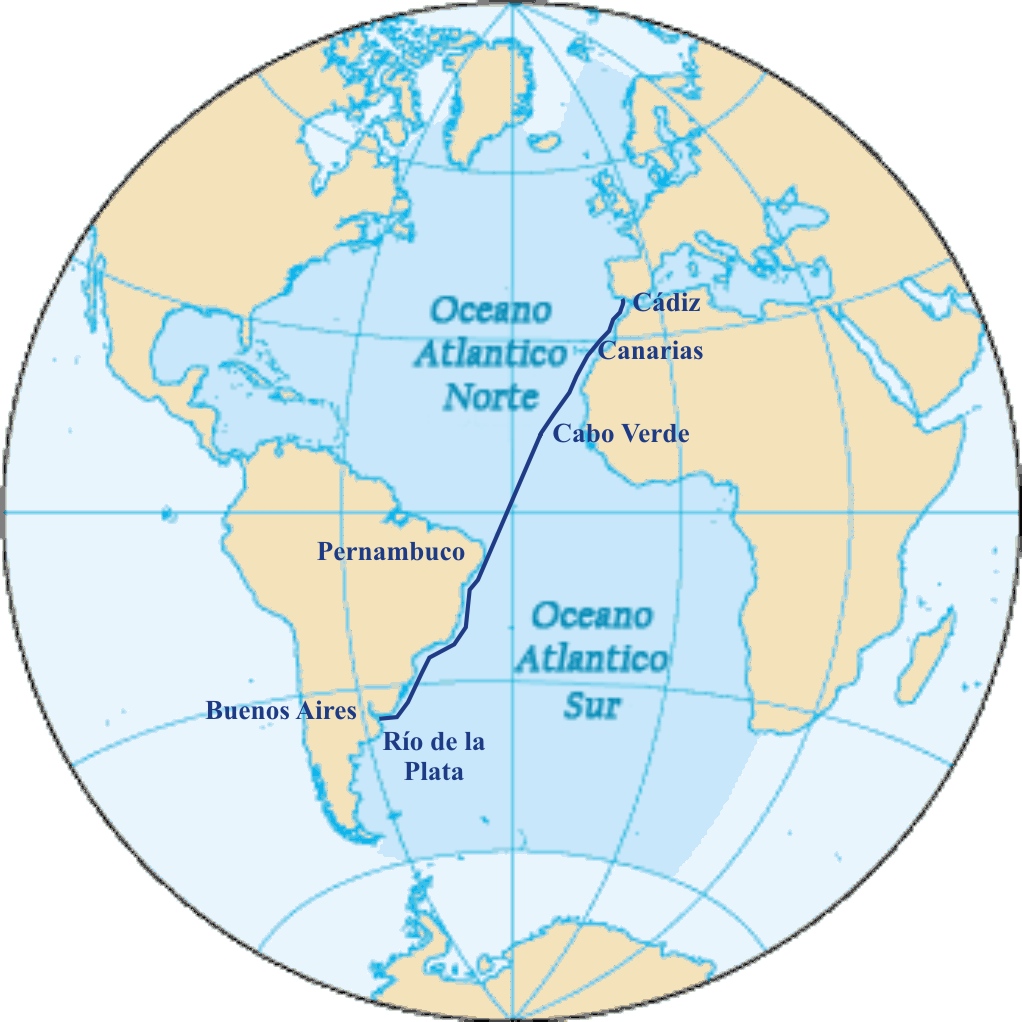 El viaje a Buenos Aires era largo, se tardaba en completarlo de tres a cuatro meses y se recorrían unos 9.500 kilómetros por el Océano Atlántico, aprovechando las corrientes oceánicas y los vientos alisios. Se partía desde las costas de Cádiz, navegando hacia Canarias, desde allí a Cabo Verde y luego se atravesaba el Atlántico navegando hacia el SO hasta alcanzar Pernambuco, en el extremo oriental de Brasil, para luego bordear las costas de Brasil hasta el Río de la Plata.