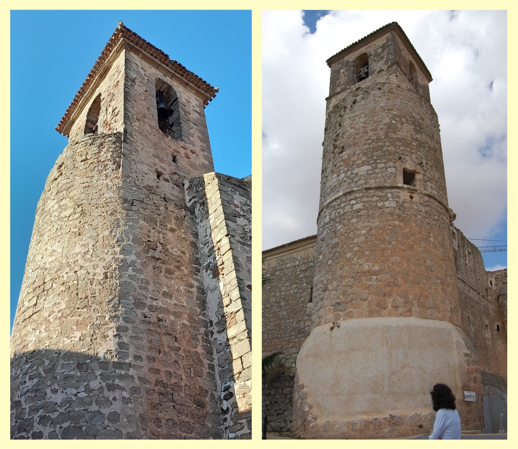 Esta misma fórmula de edificación de un campanario con forma de prisma sobre una torre de planta circular se utilizó en la iglesia de San Felipe de Brihuega, donde sobre una torre circular de la muralla se construyó un campanario de planta octogonal, o también en el Castillo de Garcimuñoz, donde sobre la torre sureste del castillo se levantó en el siglo XVIII un cuerpo de campanas de planta cuadrada.